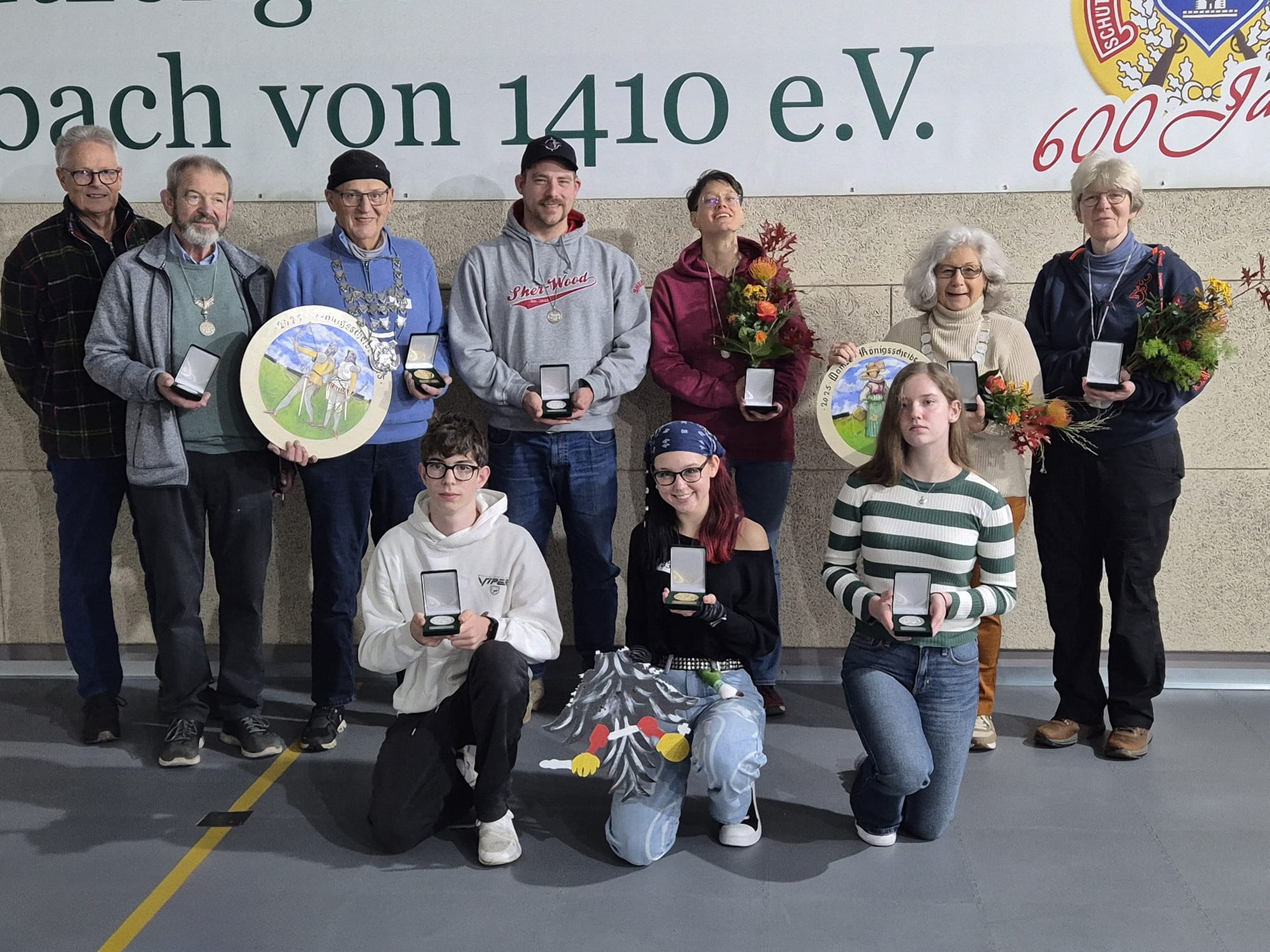 Die Würdenträger 2025 sind: König Olaf Ackermann (3. v.l.), 1.Ritter Dr. Hans-Günther Bothe (2. v.l.), 2.Ritter Maik Ludwig -Decku (4. v.l.), Königin Gisela Mörler (e. v.r.), 1.Edelfräulein Susanne Beckmann (1. v.r.), 2.Edlefräulein Jennifer Heyd (2. v.r.). Jugend-Königin Ronja Aul (vorne Mitte), 1.Jugendritter Deniz Gazi (vorne li), 2.Jugend-Edelfräulein Mirja Seiter (vorne re).